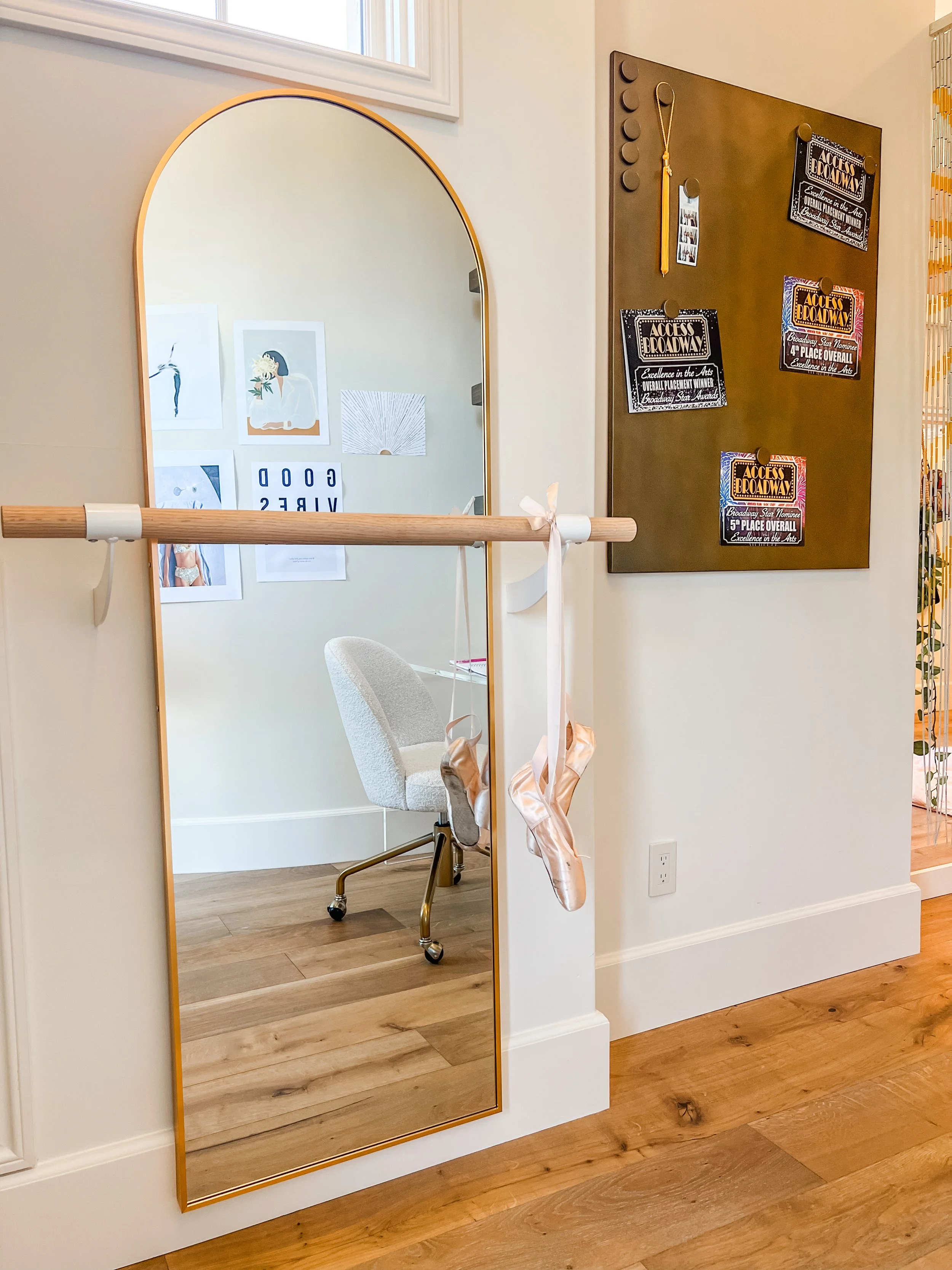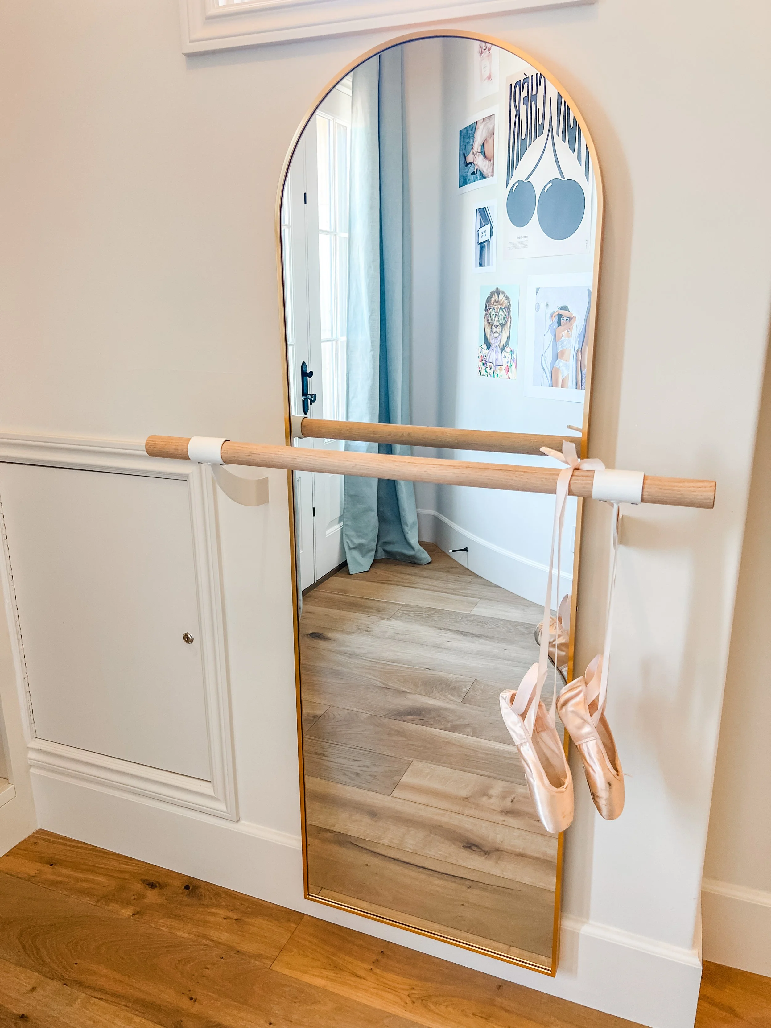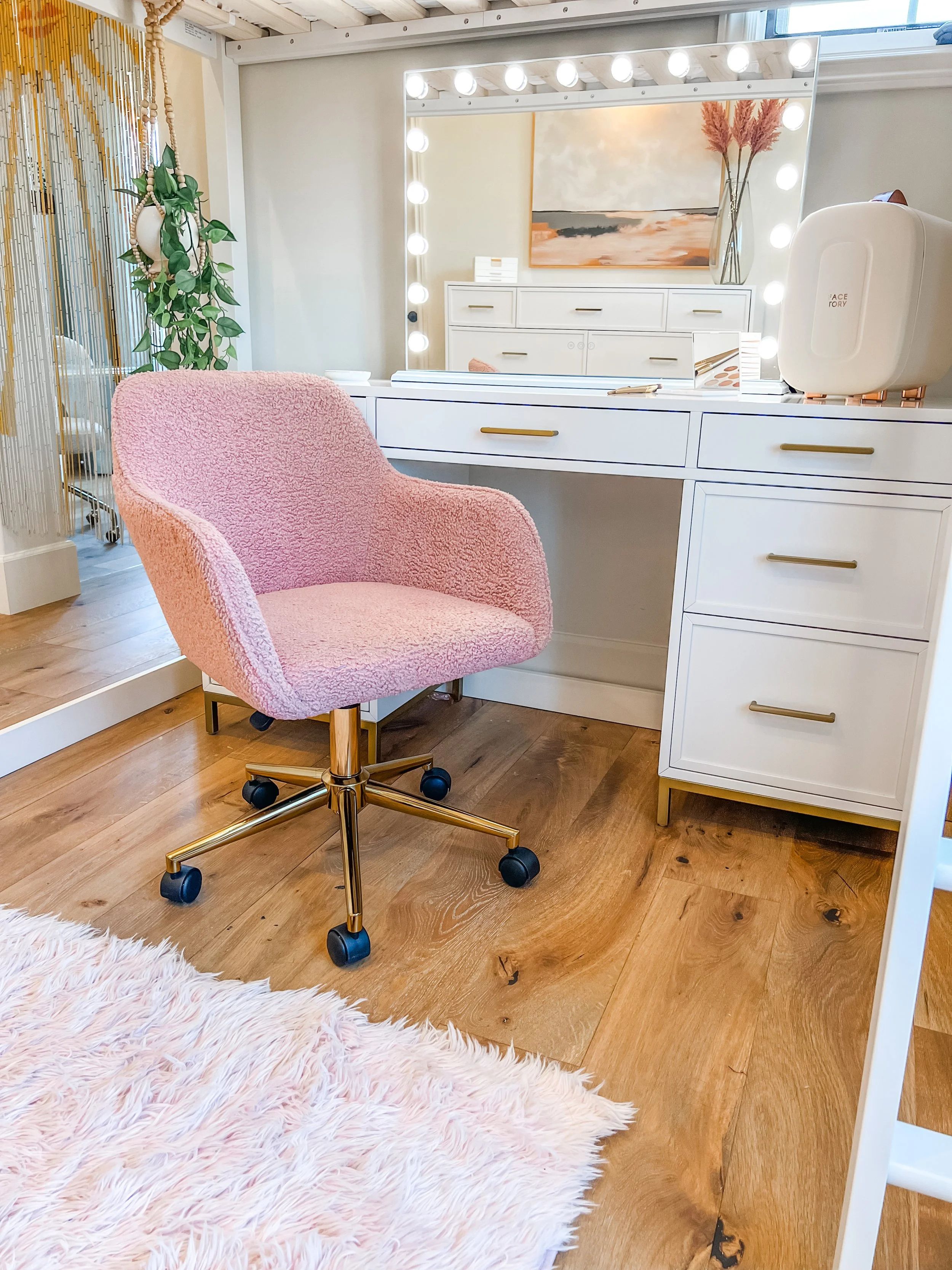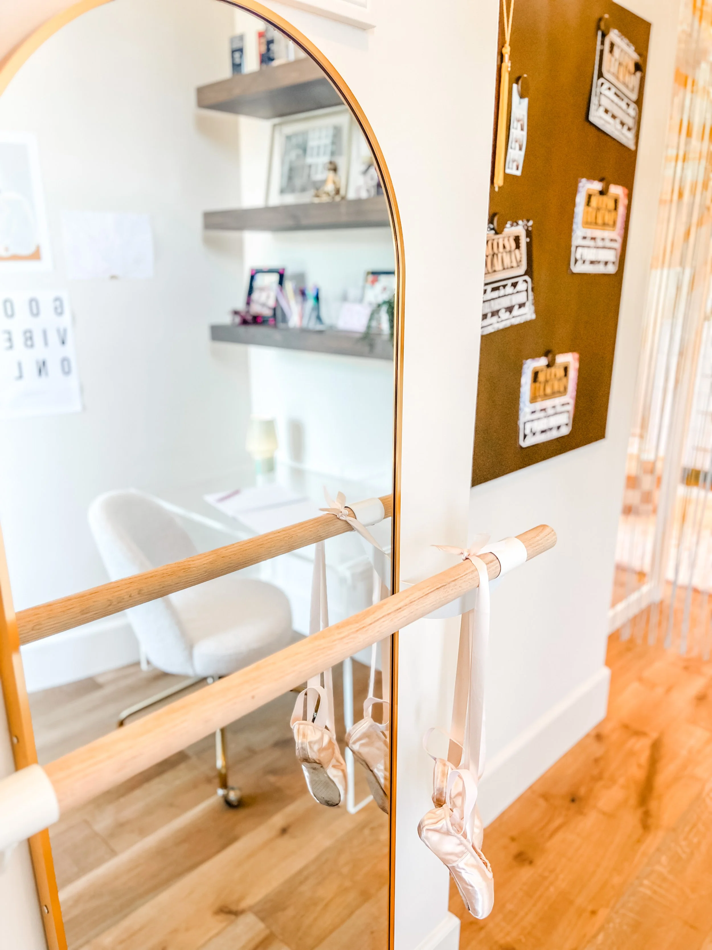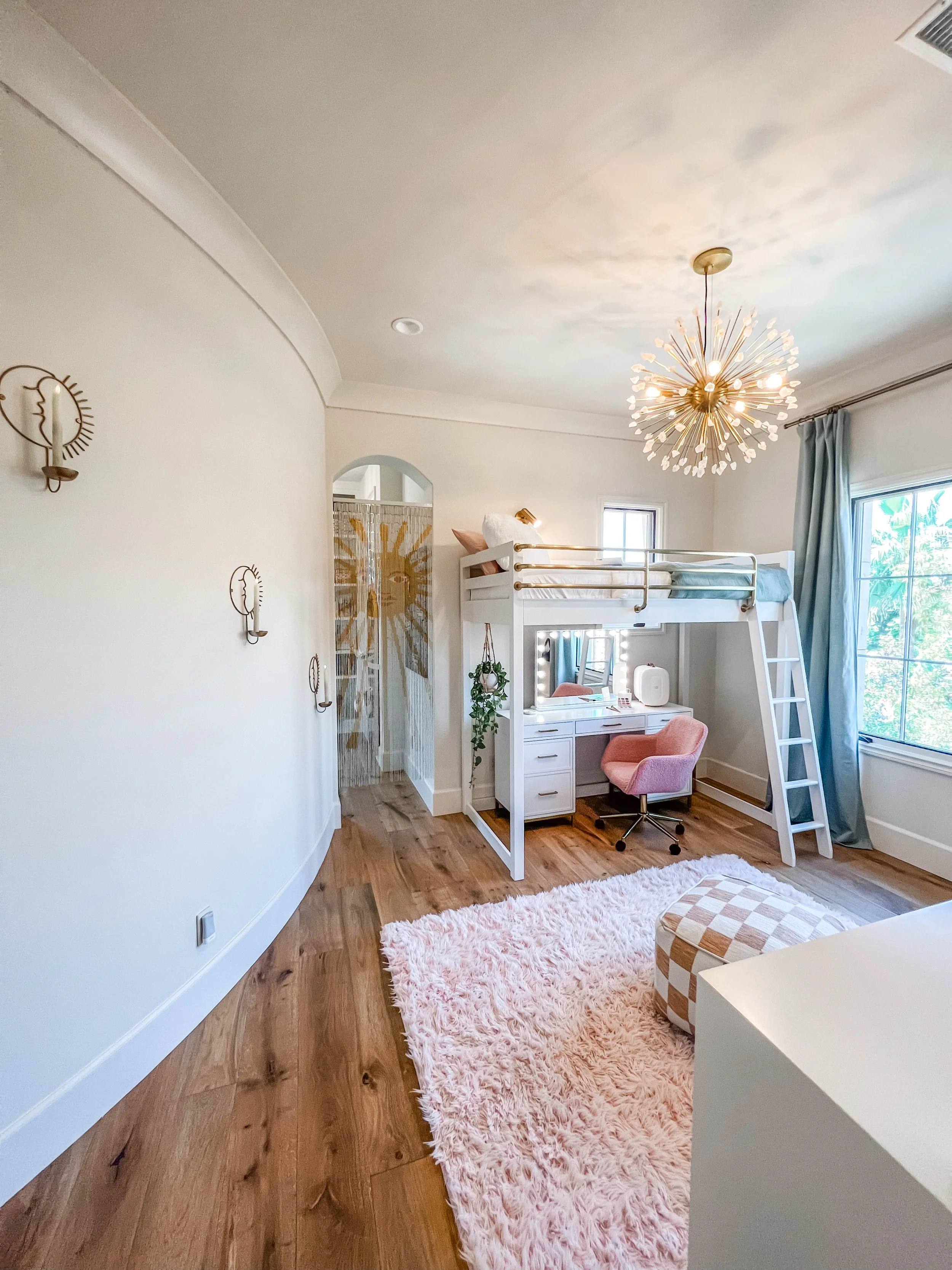 Created for a teenage client who loves all things beauty, dance, and style, this space blends soft pink tones with layered boho textures to feel playful, personal, and expressive. A full vanity setup tucked beneath her loft bed creates a dedicated spot for getting ready, while a ballet barre and floor-length mirror invite movement. Her favorite designer bags are displayed on wall hooks, adding both function and a fashion-forward touch. The room feels like a studio, a sanctuary, and a space to grow into—all in her own signature style.