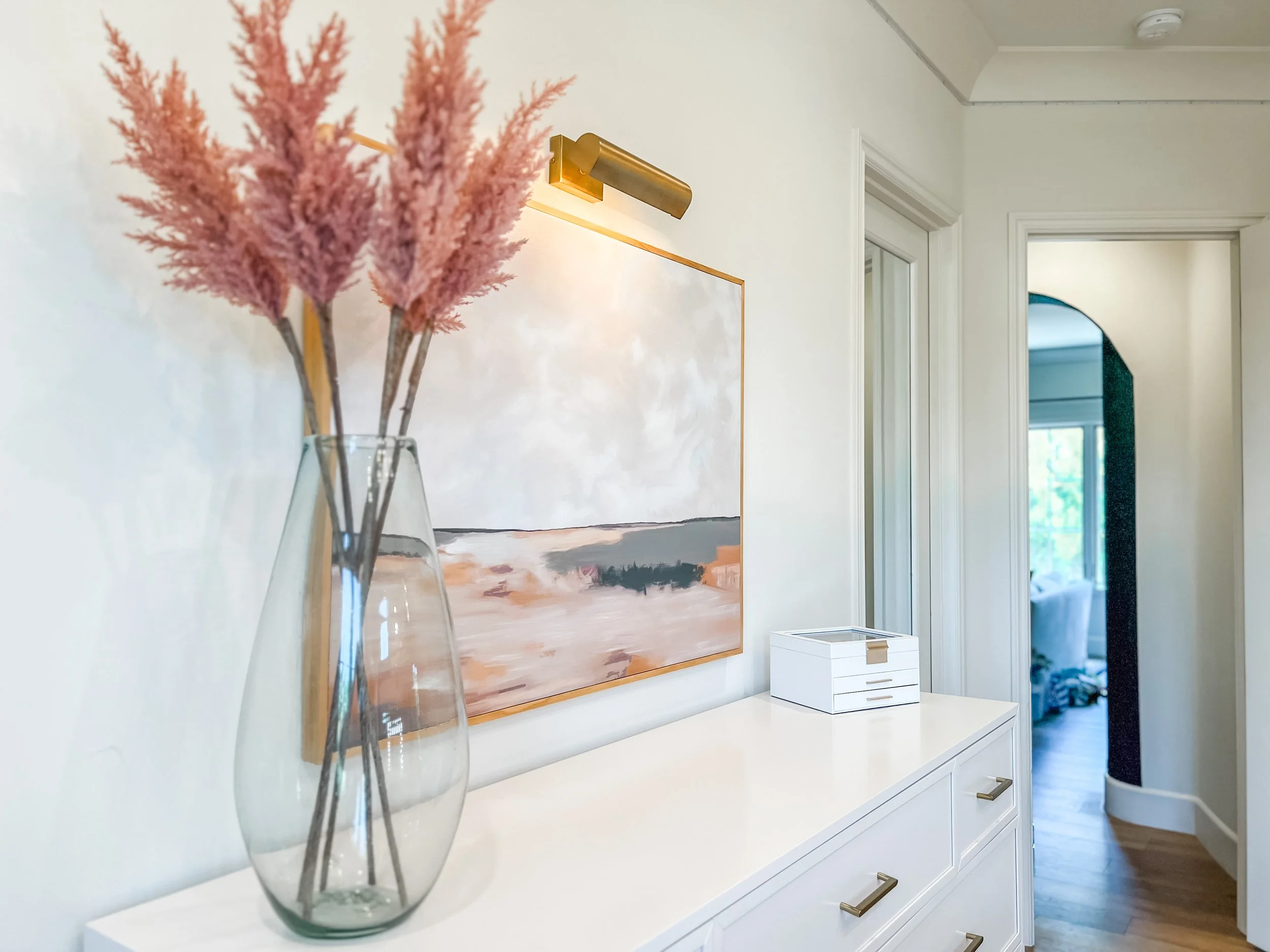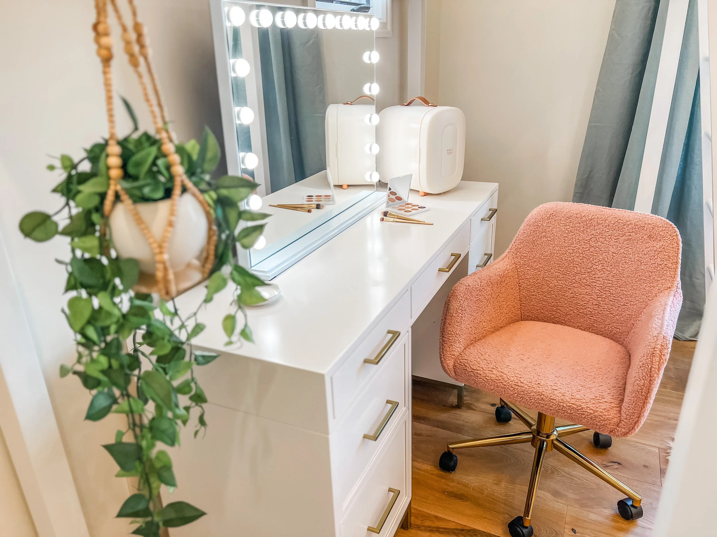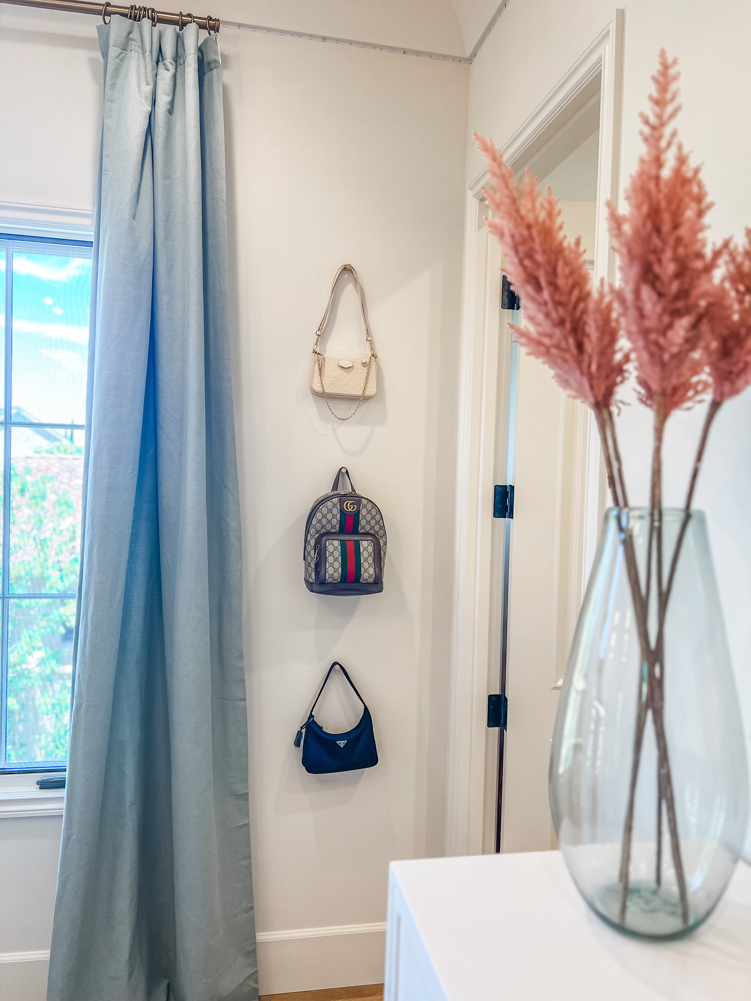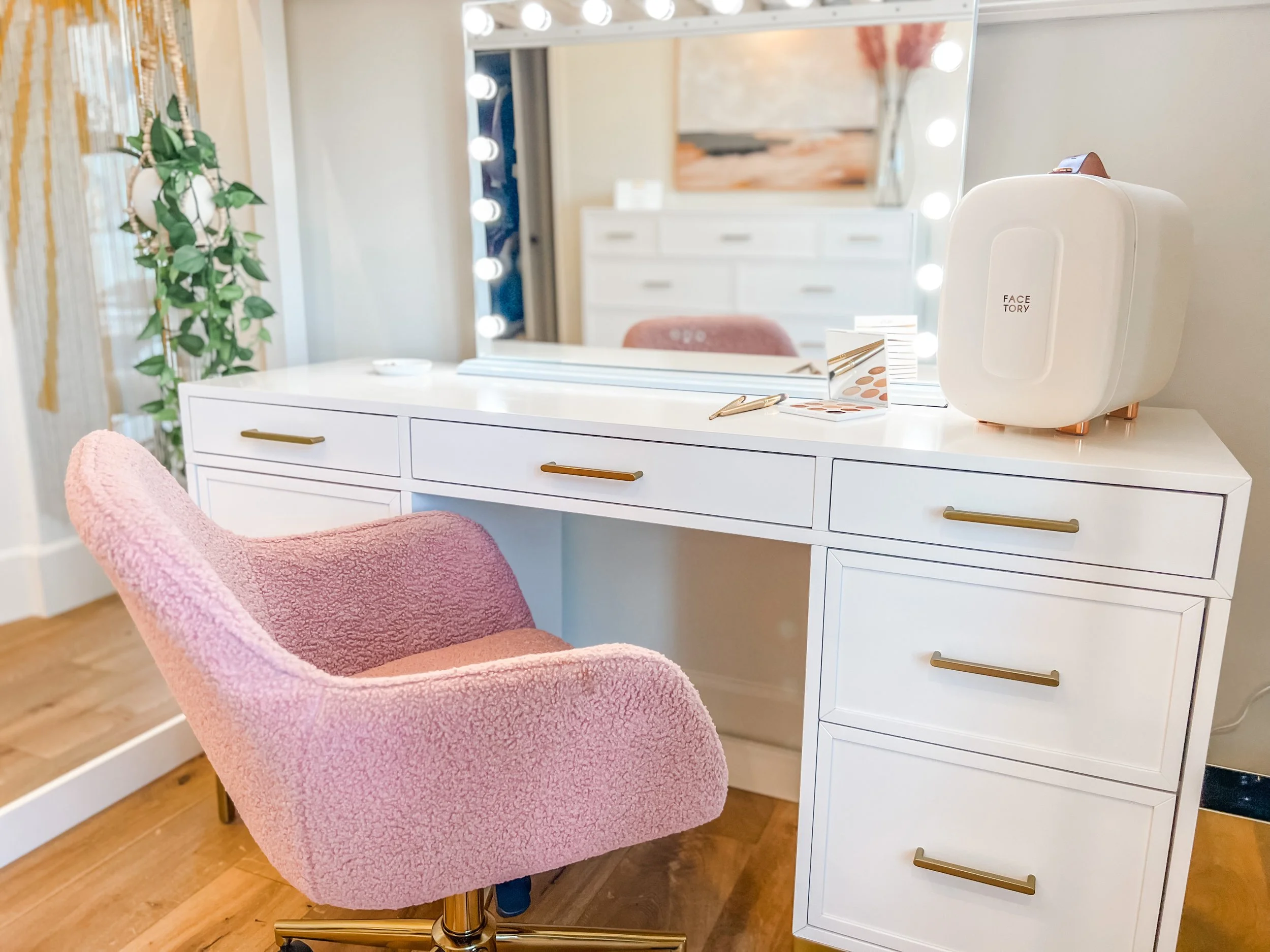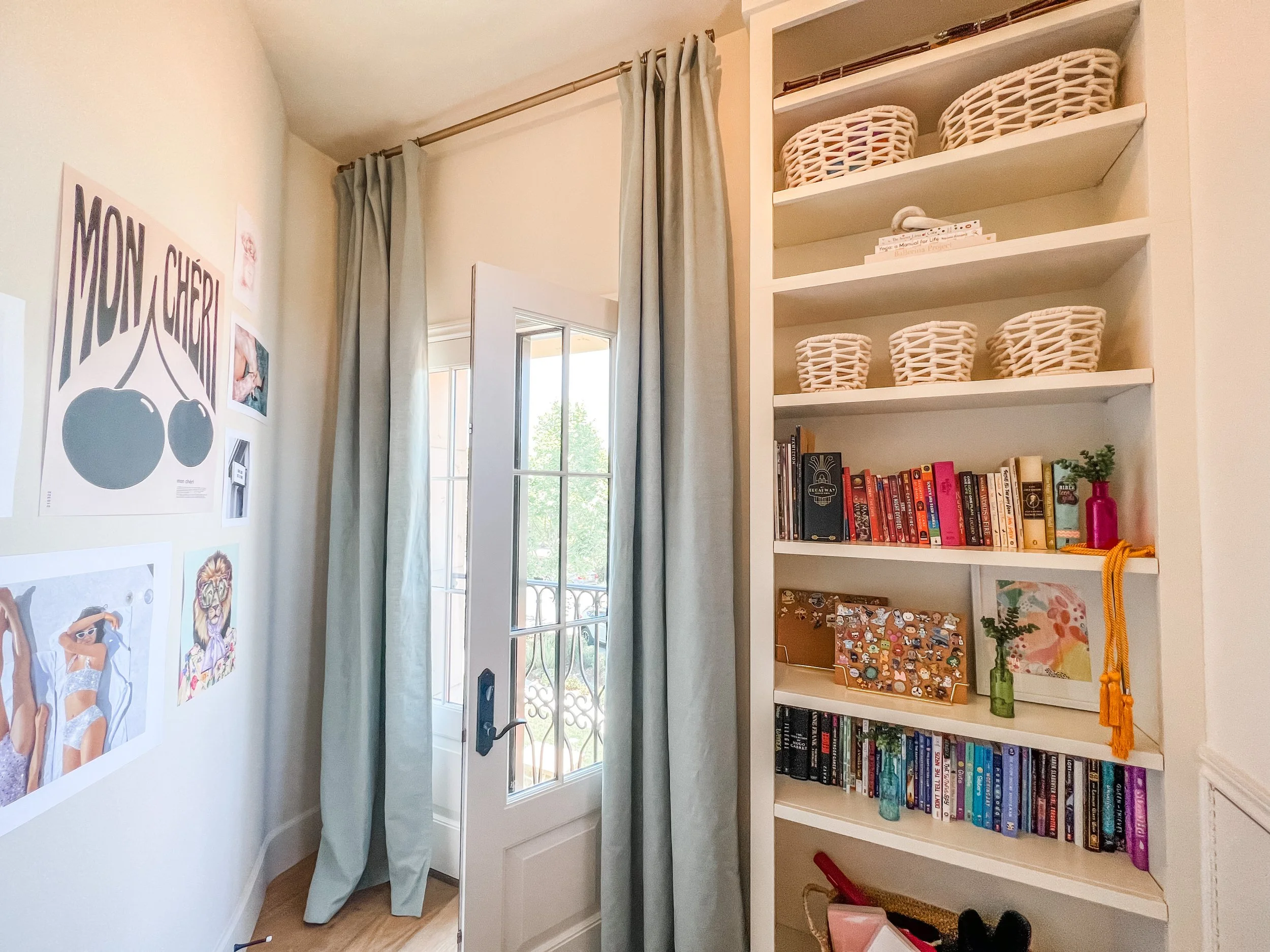 Created for a teenage client who loves all things beauty, dance, and style, this space blends soft pink tones with layered boho textures to feel playful, personal, and expressive. A full vanity setup tucked beneath her loft bed creates a dedicated spot for getting ready, while a ballet barre and floor-length mirror invite movement. Her favorite designer bags are displayed on wall hooks, adding both function and a fashion-forward touch. The room feels like a studio, a sanctuary, and a space to grow into—all in her own signature style.