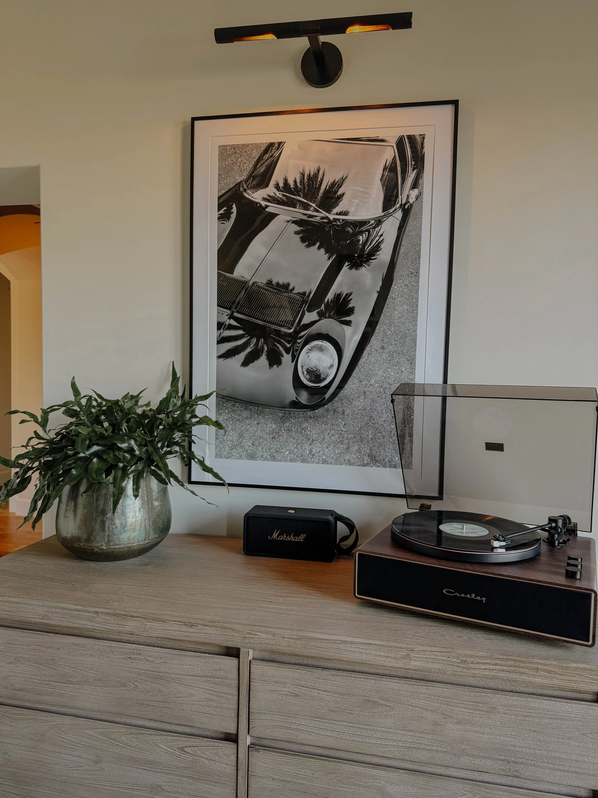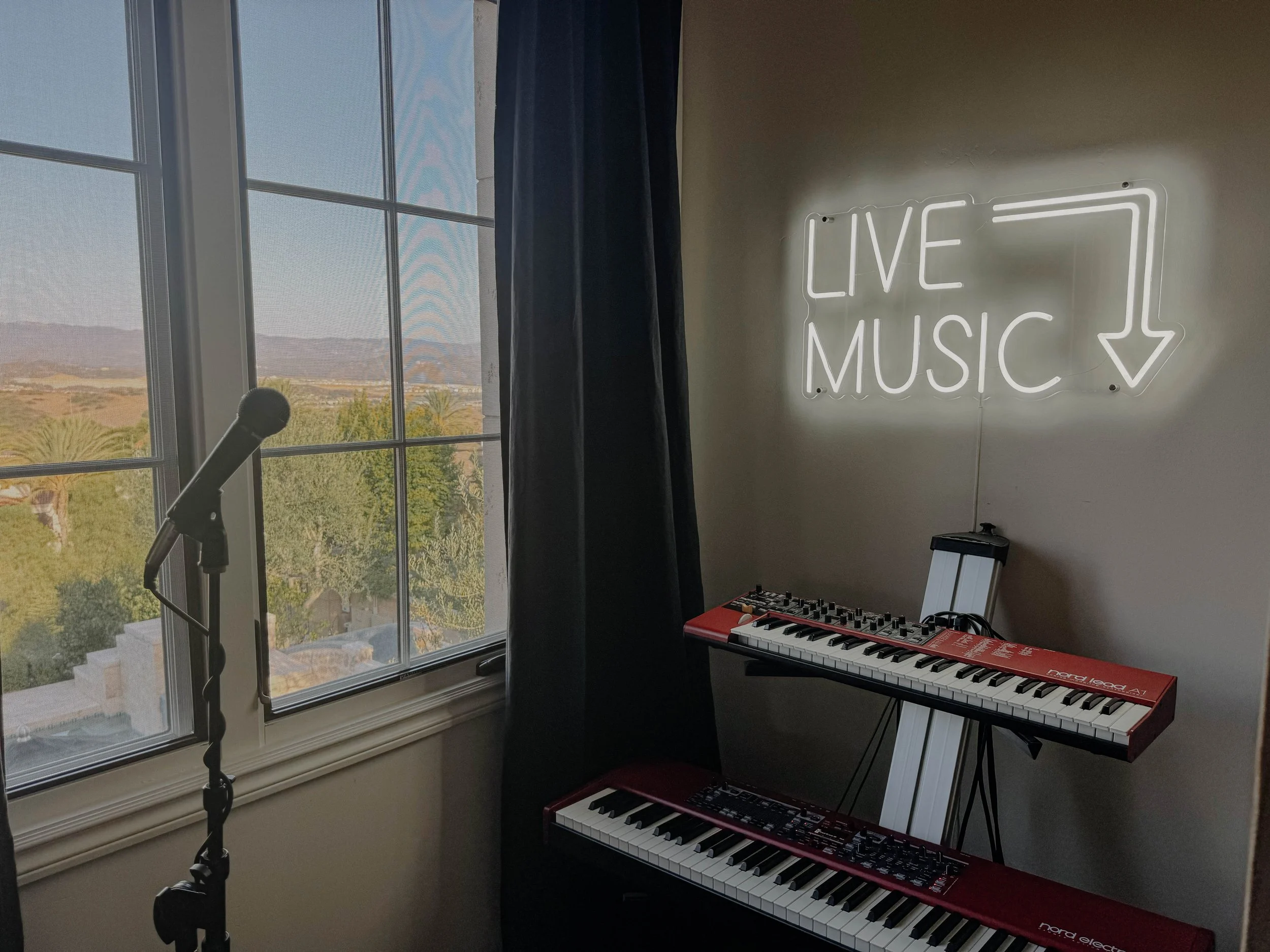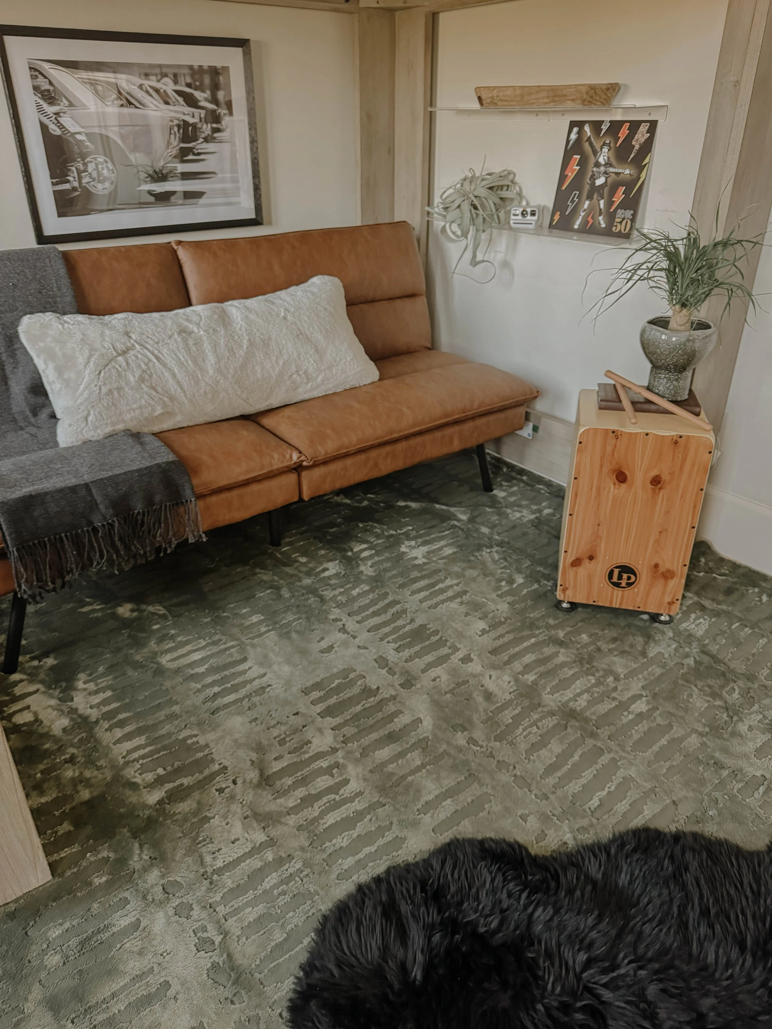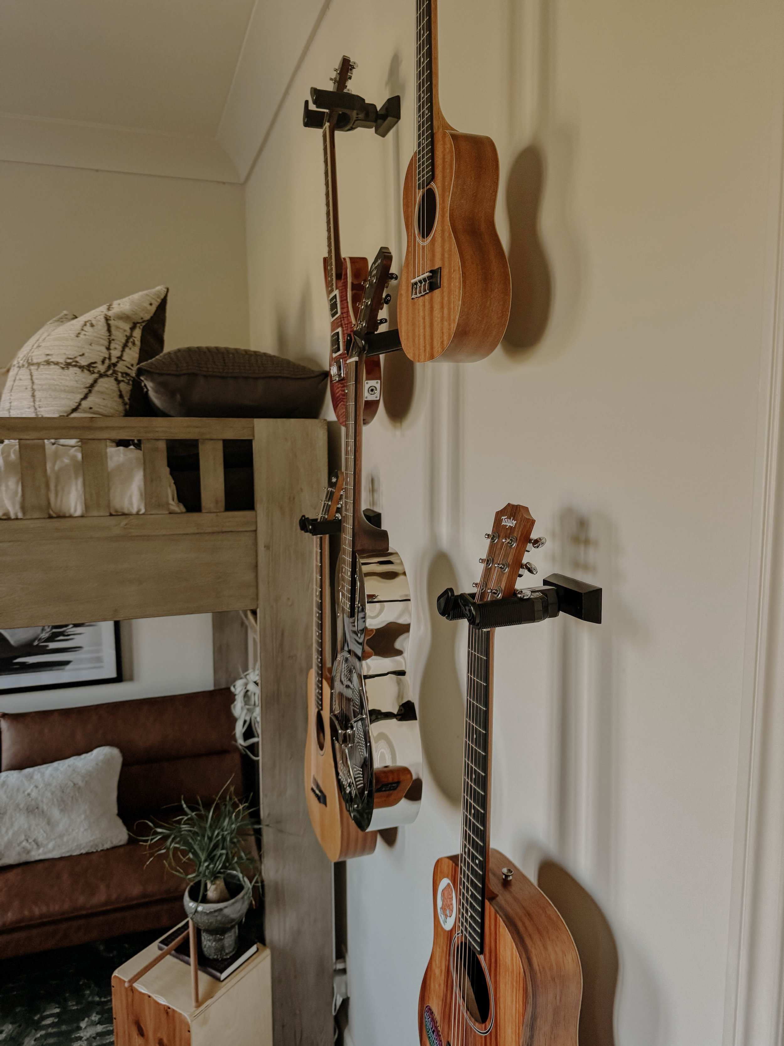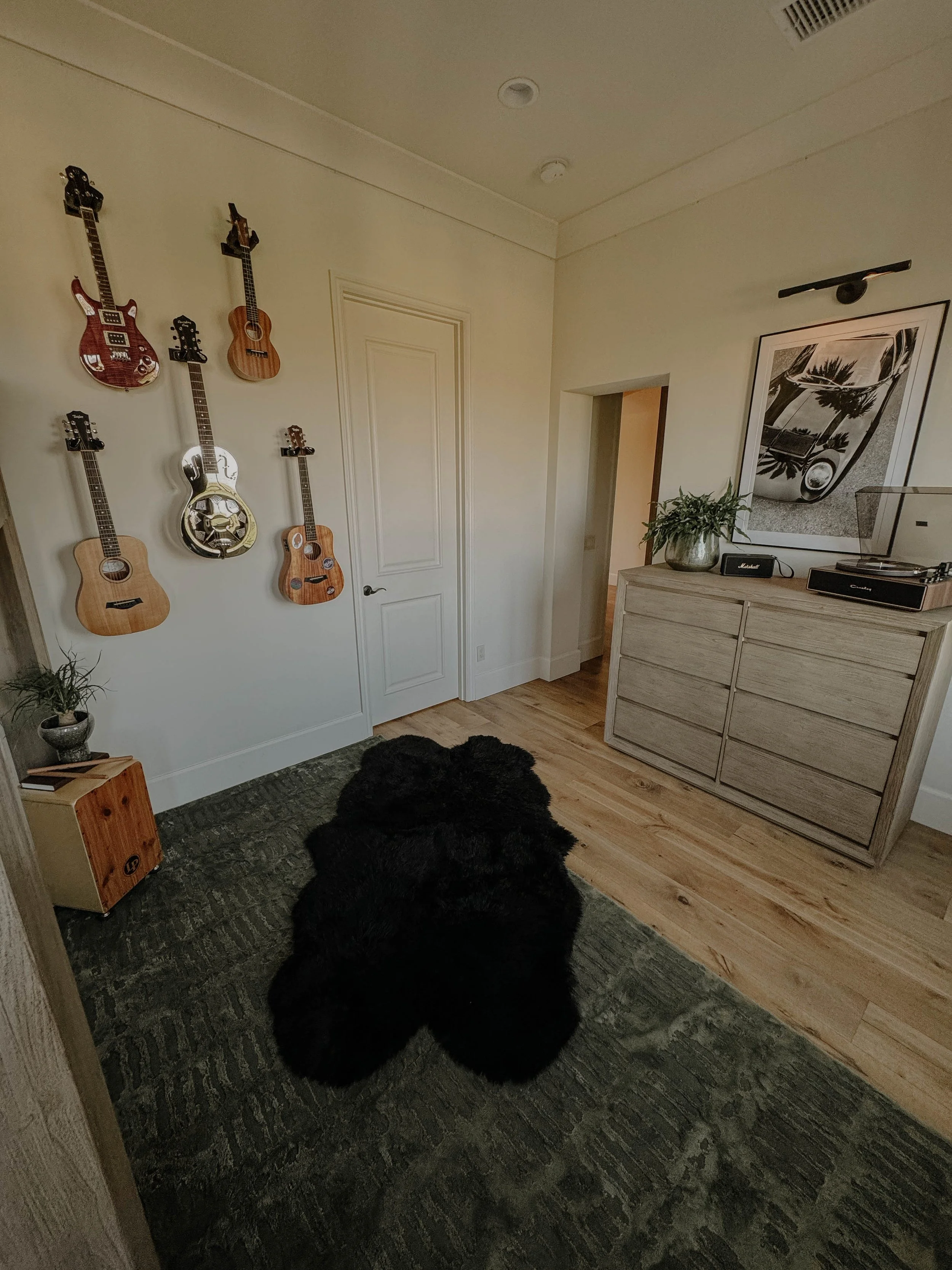 This bedroom lounge balances creative expression with a relaxed, collected atmosphere. Guitars are displayed as sculptural art, anchored by a custom neon Live Music sign that brings a warm, inviting glow. Layered rugs and vintage-inspired textures add depth and familiarity, giving the room a lived-in feel; ready for everything from quiet practice sessions to late-night hangs.